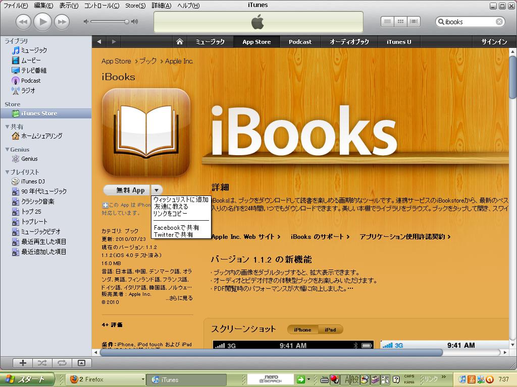目的の「iBooks」を見つけたら、アイコンをクリックして詳細ページに入るか、またはアイコンの右下にある三角をクリックするとプルダウンメニューが出てきますので、「ウイッシュリスト」に追加するを選択すると無料のアプリは「ダウンロードする」がでてきます。(画像が小さいので、リンクを張りました。クリックで拡大されます。)